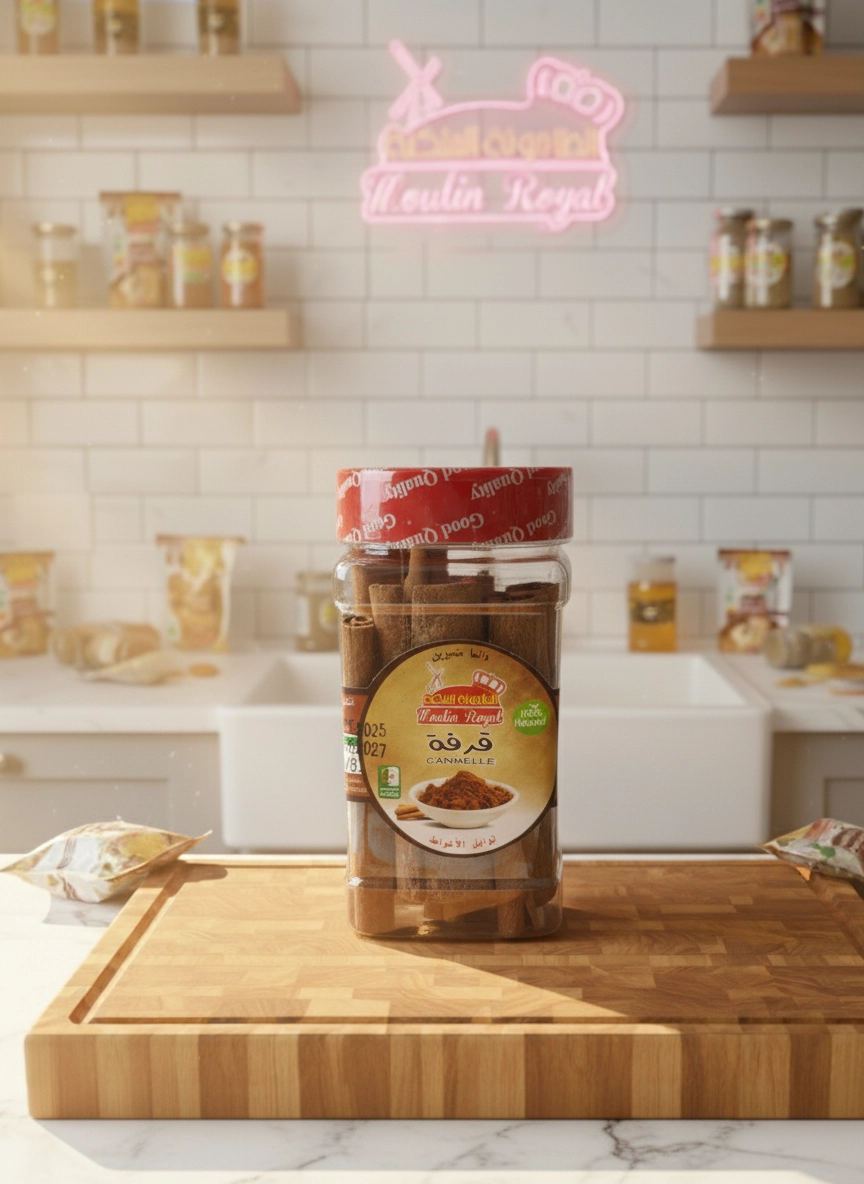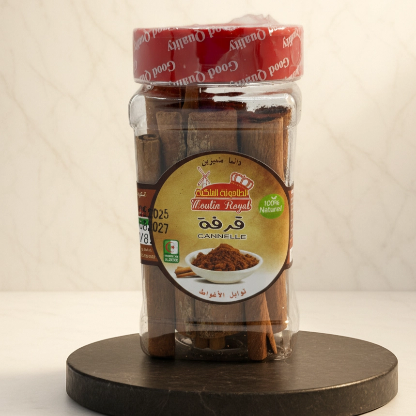 Depuis 1945, Moulin Royal vous offre les trésors de la nature avec un savoir-faire inégalé. Aujourd’hui, nous vous présentons nos bâtons de cannelle, bien plus qu’une simple épice : une véritable odyssée sensorielle à travers le temps. Chaque bâtonnet recèle l’âme de l’authenticité et la chaleur d’une histoire riche, sélectionné avec une minutie extrême pour vous garantir l’essence pure et la saveur véritable que Moulin Royal s’engage à vous offrir.Laissez les bâtons de cannelle Moulin Royal libérer votre créativité culinaire. Que vous souhaitiez infuser une chaleur exceptionnelle dans votre tasse de thé matinale, orner vos pâtisseries orientales d’une touche de splendeur, ou enrichir vos plats de viande et de riz d’un parfum oriental profond, ces bâtonnets sont le secret des recettes inoubliables. Imaginez leur fragrance envoûtante se mêlant aux saveurs de vos mets, créant une expérience gastronomique royale, d’une richesse incomparable.Chez Moulin Royal, nous sommes convaincus que les ingrédients authentiques sont le pilier de toute création culinaire. C’est pourquoi nos bâtons de cannelle vous sont proposés 100% purs, sans aucun additif, assurant que vous recevez l’essence même de la cannelle, avec sa chaleur naturelle et ses bienfaits ancestraux. Ce n’est pas seulement une épice, c’est une invitation à sublimer vos plats et à faire de chaque repas une célébration de la saveur authentique et de la qualité supérieure qui sied à votre cuisine.