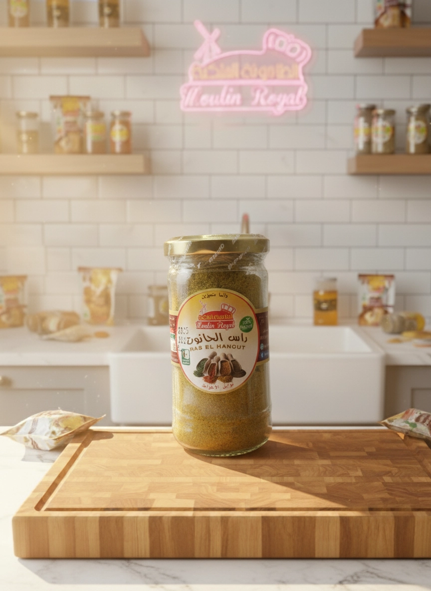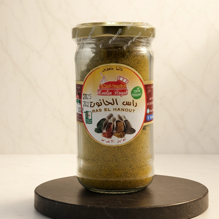 Au cœur de chaque cuisine authentique réside un secret transmis de génération en génération. Chez Moulin Royal, nous sommes fiers de vous présenter notre Ras el Hanout, le fruit de notre expertise depuis 1945. Ce mélange légendaire, dont le nom signifie « tête de l’épicerie », est le couronnement des épices les plus fines que notre terre généreuse nous offre, sélectionnées avec une minutie inégalée. Plus qu’un simple assaisonnement, c’est une véritable odyssée aromatique qui captive les sens, fusionnant la chaleur de l’Orient et l’authenticité de l’Afrique du Nord pour une saveur profonde et complexe, inoubliable.Notre Ras el Hanout est composé à 100% d’ingrédients naturels, rigoureusement choisis pour garantir la pureté et la qualité supérieure que vous attendez de Moulin Royal. Avec son parfum envoûtant et sa richesse gustative, oscillant entre une douceur subtile et une vivacité équilibrée, ce mélange enchanteur est la touche royale parfaite pour sublimer vos tajines mijotés, vos chorbas réconfortantes, et vos plats de viandes ou volailles grillées. Il transforme même une simple soupe en un festin somptueux grâce à l’harmonie de ces épices d’exception.Que vous soyez un chef aguerri en quête d’inspiration ou un cuisinier passionné désireux d’offrir le meilleur à votre famille, le Ras el Hanout de Moulin Royal vous apportera la confiance nécessaire pour transformer chaque repas en une œuvre d’art culinaire. Laissez-le être votre clé magique pour éveiller les saveurs authentiques et enrichir votre table d’un héritage gastronomique ancestral. Découvrez-le dès aujourd’hui et laissez vos plats raconter des histoires d’authenticité et de goût raffiné, gravées dans les mémoires.