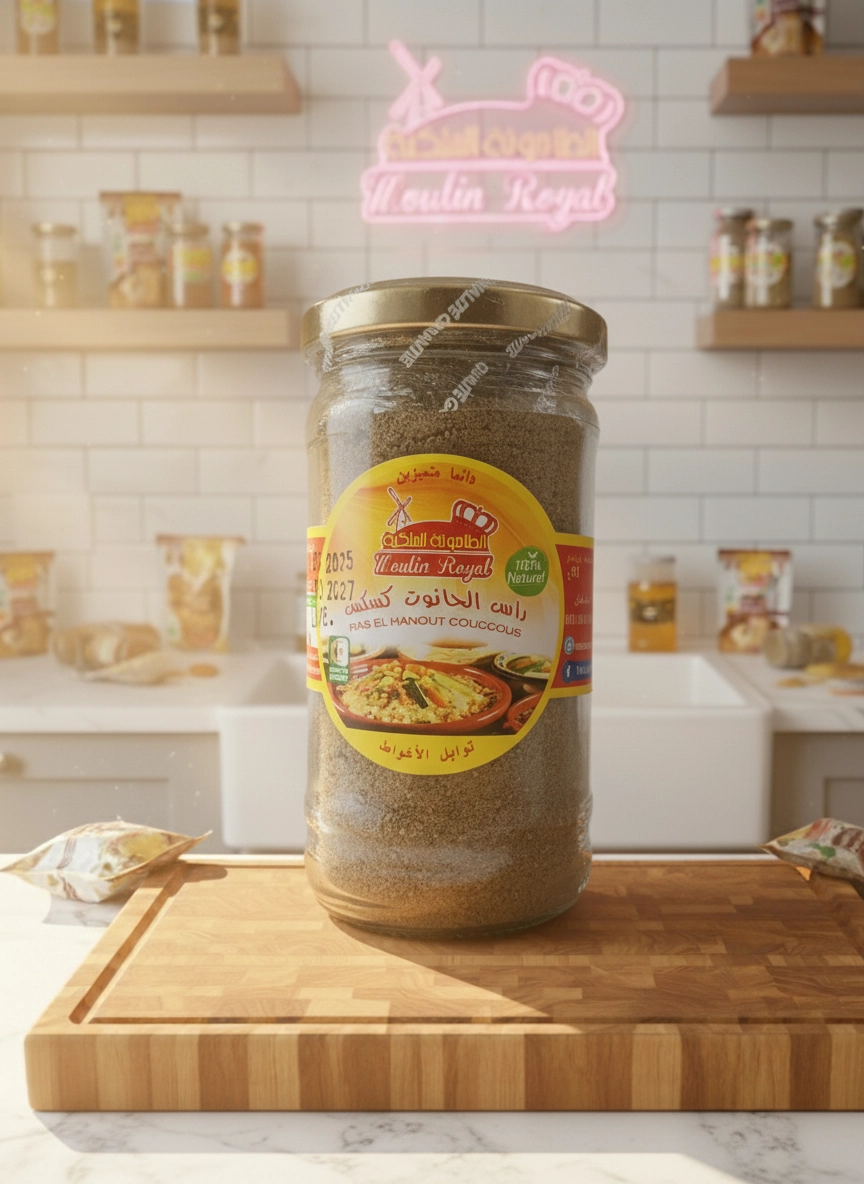 اكتشف سر الكسكس الملكي مع توابل رأس الحانوت الفاخرة من الطاحونة الملكية. مزيج أصيل يوقظ الحواس وينقل طبقك إلى قمة النكهة الجزائرية العريقة.